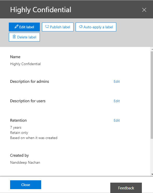 Office 365 Retention Labels » ADMIN Magazine To create a retention label, go to Classifications | Labels in OSCC and click on the Create a label button. In the panel that appears, enter a unique and meaningful name for the new retention label. You can then also enter one description for administrators and another for users. Click Next (the list on the left is apparently only for navigation).